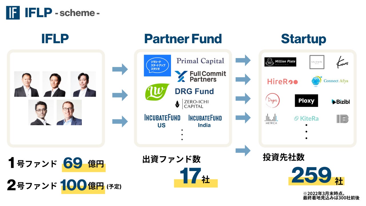 2018年にはリミテッド・パートナー(以下、LP)出資に特化したファンド「IFLP」を69億円で設立し、2022年3月末時点で17ファンドへLPとして参加、出資先ファンドを通じて総計259社社のスタートアップへの投資組入が進捗しております(最終着地見込みは300社前後)。